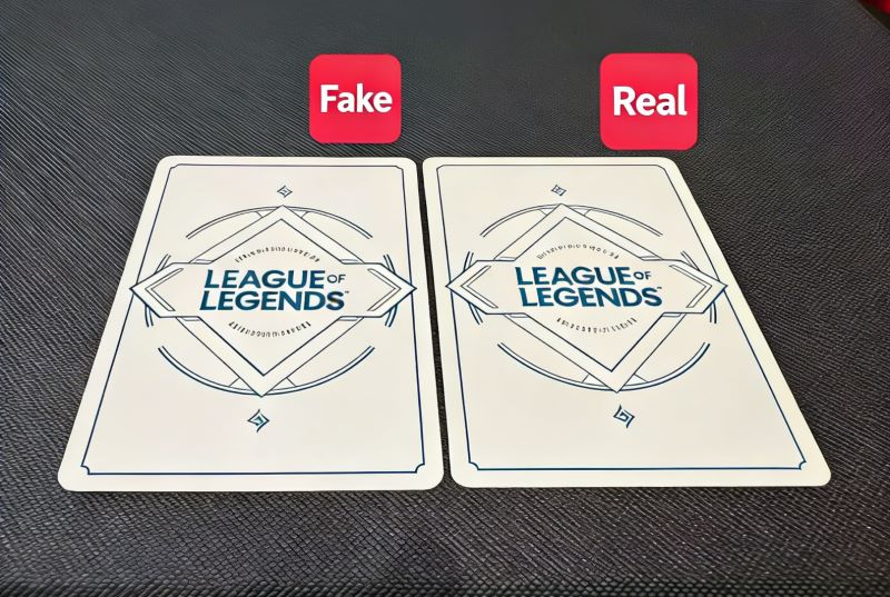 Check the card back directly: real card on the right, fake on the left. Genuine backs have a warm milky yellow tone; fakes are cold bluish white. Normal rune cards can also be compared this way.