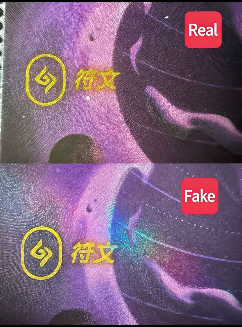 Gold foil rune details: Real foil has slight color inconsistency between purple and green parts. Overall, genuine gold looks fused into the card material; fake gold sits flat on the surface like a printed layer.