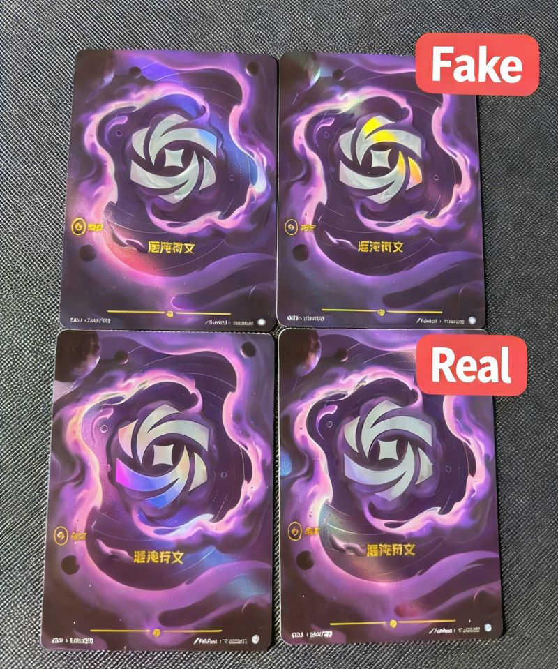 Check the card back directly: real card on the right, fake on the left. Genuine backs have a warm milky yellow tone; fakes are cold bluish white. Normal rune cards can also be compared this way.
