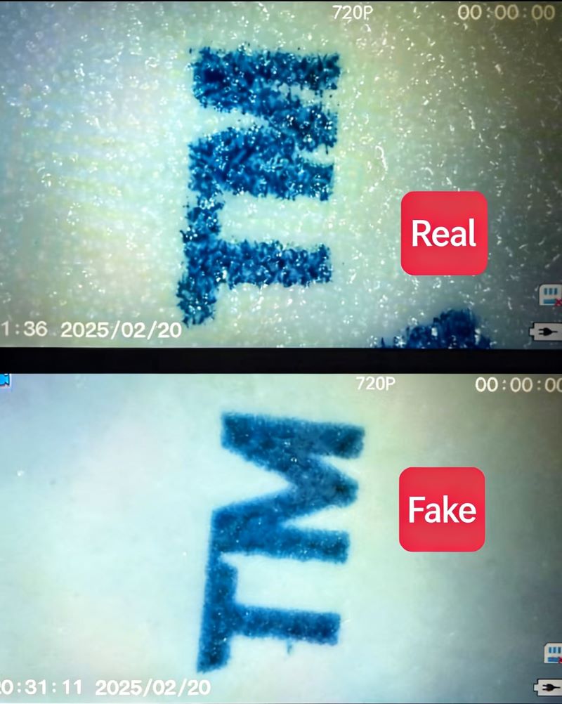 These are the most obvious differences. With a magnifying glass, check the back printing: genuine print is slightly blurry with a sprayed texture, while fakes look unnaturally sharp and clear.