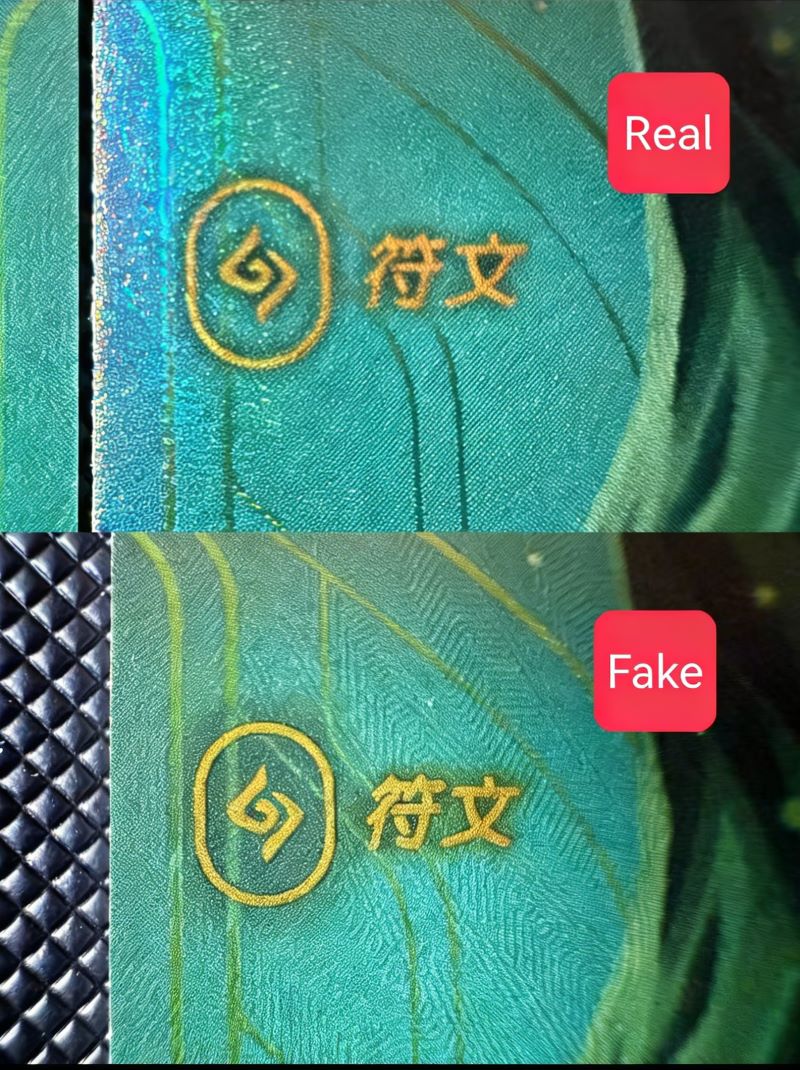 Gold foil rune details: Real foil has slight color inconsistency between purple and green parts. Overall, genuine gold looks fused into the card material; fake gold sits flat on the surface like a printed layer.