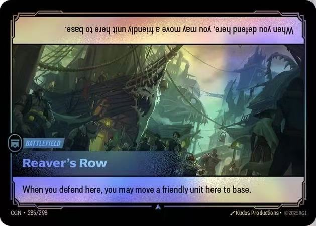 I describe this battlefield card as a “cheap, cheesy” card, but I also acknowledge that it is not unreasonably strong. With Reaver’s Row, the first player can spam units without saving mana—when not playing against Kai’Sa, they can retreat when taking damage; if the opponent does not save mana, they have to retreat when attacked; if the opponent saves mana, the first player can switch to another battlefield to outlast them. I believe this card is only particularly strong against pure tank decks and has counters. Its ban is largely “killed by Draven”—because it is often paired with Draven decks to amplify advantages, and its ban also indirectly affects Irelia and Kai’Sa decks, making them take a small hit. Overall, I think it’s acceptable for this card to be ban.