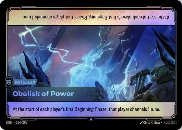 This is the ban I consider the most reasonable. Casual players may not realize how broken this card is: first, it can disrupt the first player’s mana—since many cards in the game cost even Rune, suppressing the first player’sRune  often leaves them with 1 unused Rune; second, for the second player, it allows them to directly play a 4-Rune unit, enabling 4-power units to win battles without tricks (unlike 2-power units that need tricks to win); third, it enhances deck thickness—late game, new players might get bad draws with 2/2 units, but if you’re playing second with Obelisk of Power, your deck only has 4/4 units, so your deck is naturally better than the opponent’s. Basically, with this card and some deck adjustments, you can replace all low-stat units, giving you a natural resource advantage late game. By the end of Set 2, the meta was basically about whether your deck could deal with Obelisk of Power when playing second.